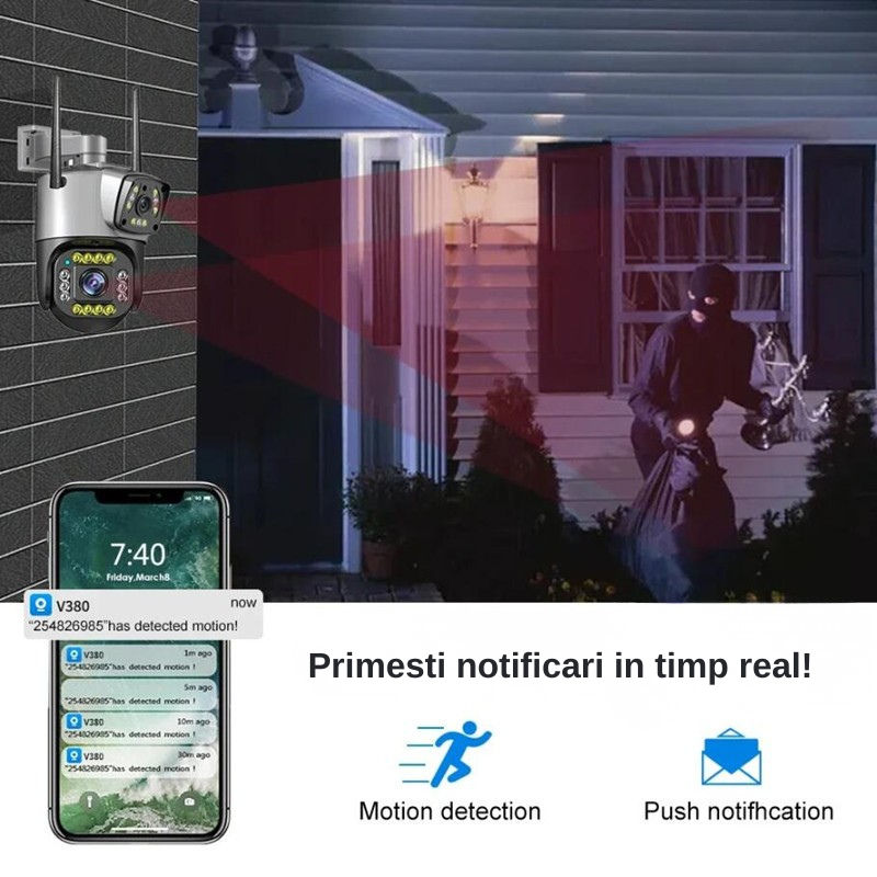 Cameră de supraveghere WiFi exterior, 4MP, lentile duale, PTZ 360, noapte, aplicație V380